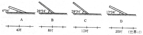 1、综合题 下图为北半球四地点在6月22日不同时刻测到的当地太阳位于正南方时的太阳能热水器倾角示意图。
