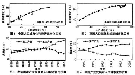(1)读图1中A点可知,在某一历史肘期,我国经济城市化、人口城市化水平分别约为?%和?%。由趋势线可见,我国现代城市化过程中,经济城市化水平与人口城市化水平相比,发展水平较高的是?。(3分) (2) 图1、图2可以显示,总体而言,无论是我国还是英国,经济城市化水平与人口城市化水平两项指标相比,发展水平始终居高的是?。20世纪50年代以来,我国和英国相比,人口城市化水平较高的国家是?,经济城市化与人口城市化发展水平的差异程度较大的国家是?。(3分) (3)比较图4与图3,可以看出我国第二产业与第三产业对人口城市化发展贡献度的变化存在哪些不同特点? ________________________________________________。(3分) (4)通过以上分析,在我国人口城市化与经济城市化的进程中,尤其应该关注第_____产业的发展?说明其理由。_____________________________________________________。(3分)