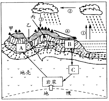 (1)图中A、B、C构成了岩石的转化,其中属于岩浆岩的是______(字母),属于沉积岩的是____(字