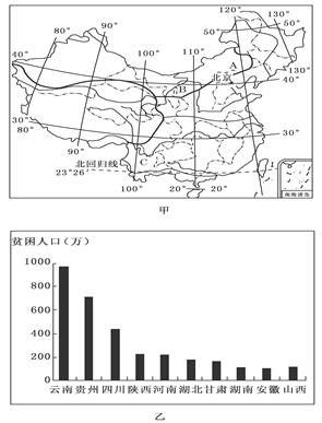 (3)乙图中,我国贫困人口最为集中的是________省,简要分析该省贫困人口集中的自然和社会经济条件。