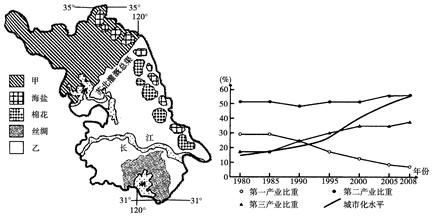 小题4:江苏省矿产资源缺乏,因此不具备发展石油工业和钢铁工业的优势条件;南北部由于地理环境的不同,需发展具有各自特色的产业;随着社会经济的发展,第一产业比重在下降 ,第二、三产业比重在提升,应发展符合可持续发展的产业,进行产业升级。故D项正确。