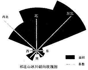 4、单选题  下图为“祁连山冰川朝向玫瑰图”,它是把祁连山总的冰川条数和面积分成100份,把其中1份作为一个长度和面积单位,按不同的方向绘制。读图回答1~3题