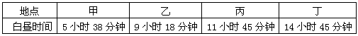 4、单选题  表格中所列的是2009年1月1日四地白昼时长,根据表中数据回答1—2题。