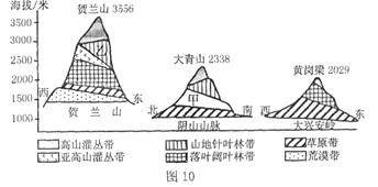 小题1:甲位于阴山的草原带上部;则比较贺兰山与大兴安岭,草原带往上应为落叶阔叶林带;