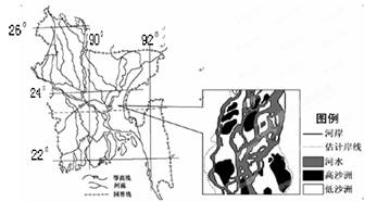 ⑵ 右图是布拉马普特拉河在孟加拉国境内 A 河段(贾木纳河)的部分辫状河道示意图。运用所学的地理原理简要分析辫状河道的成因;(4 分)并简要分析这种地貌特点对孟加拉的洪水灾害有怎样的影响?(2 分)