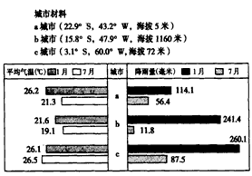 (1)结合所提供的信息,比较a,b,c三城市的1月、7月平均气温与降雨量,写出温差变化最小和降雨