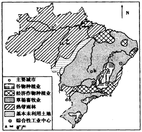 (2)巴西综合性工业中心分布不均衡,主要分布在气候温和、矿产资源丰富的东南沿海地区。a城市的