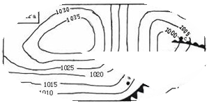 A.沙尘暴 B.干旱 C.泥石流 D.暴雪 参考答案:小题1:A 本题解析:小题1:此题主要考查如何识别等压线。由图可知,Pa>1 010 hP,1 010 hPa>Pb>1 005 hPa;PC<l 005 Pa。故可知Pa>Pb>Pc。小题2:首先,明确由于图中所示高压中心气压值可达l 035 hPa,可知该气压中心只能是亚洲高压,出现在亚欧大陆的冬季。在亚洲高压的前缘有—个冷峰,在它的影响下,我国北方会出现大风降温天气,有时会有寒潮,所以此时我国北方可能出现沙尘暴、干旱和寒潮等天气。而泥石流的出现需要有大量降水这一条件,所以不可能出现。 本题难度:一般 2、单选题 下图为某月海平面等压线分布图,读图回答下列各题。 |