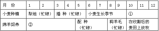 2、综合题 下表表示澳大利亚小麦-牧羊农场的农事安排,读图1、2,完成下列各题。(10分)