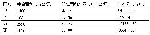 2、下表为2007年亚洲四个国家水稻生产情况统计表。甲、乙、丙、丁代表的国家依次是