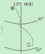 (2)如果图中为120°W:甲地为温带海洋气候,加上位于山地迎风坡,降水较多。乙地为地中海式气候,降水不足,加上气温较高,蒸发量大,因此水资源差异是甲地多,乙地少。如果图中为120°E:我国东部沿海,甲地为温带季风气候,乙地为亚热带季风气候,乙地雨季较长,降水总量大,水资源是南多北少,即乙多甲少。
