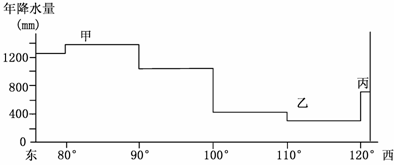 小题1:根据图示:该地经度向东减少,所以为西经,该地位于北美大陆。所以乙的年降水量少的原因是位于北美海岸山脉的背风坡,地形较为封闭,所以降水稀少。所以本题选择C选项。