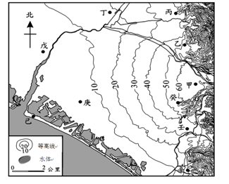 小题1:图示聚落分布于河谷阶地,离河流有一定距离,故利于防御洪涝灾害,而③处多山地,地形崎岖,且离河流较远,不利于用水。
