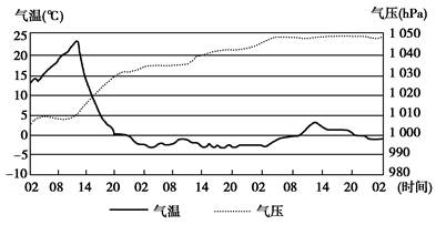 【小题1】图示天气系统,随着时间变化,气压上升,气温下降,应是冷锋过境;该天气系统发生在我国西北的4月,正是春季,地表疏松物多,冷锋过境时,可能出现大风和沙暴天气。选D正确。