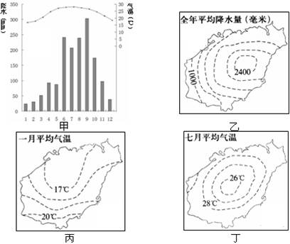 材料二:海南岛气候资料图(下图):海南岛气温降水直方图(甲)、海南岛全年平均降水量分布图(乙)、海南岛1月平均气温分布图(丙)、海南岛7月平均气温分布图(丁)。