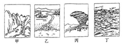 (1)图中丁处地质构造名称是_________ (背斜,向斜,断层)