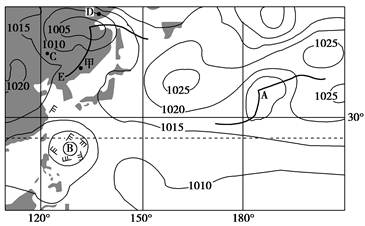 (4)判断图中字母E代表的锋面类型名称:描述当锋面E移到甲地时,甲地的天气现象。(2分)