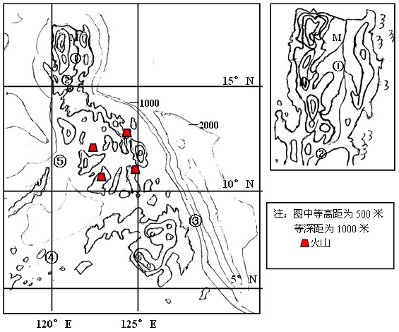 (2)③处等深线较⑤处密集,原因:③位于大陆板块和大洋板块交界处,挤压形成海沟,⑤处在板块内部,且处于众多岛屿间较平坦的大陆架,海底起伏小。