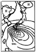 5、单选题 该图为2011年9月20日某区域天气系统图,21日该天气系统中心移至图中A处。回答问题。