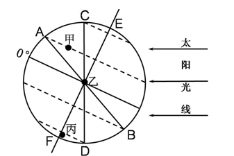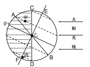第(3)题,如下图所示,阴影部分为黑夜,故该日甲、乙、丙三地中: