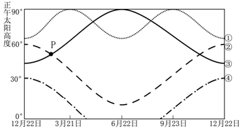 4、单选题 下图中①②③④分别是不同地区正午太阳高度年变化曲线,读图回答下列各题。
