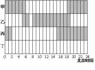 小题3:根据0时平分黑夜,12时平分白天,从而可以依据北京时间计算出四地的经度,位于西半球的是丙和乙。