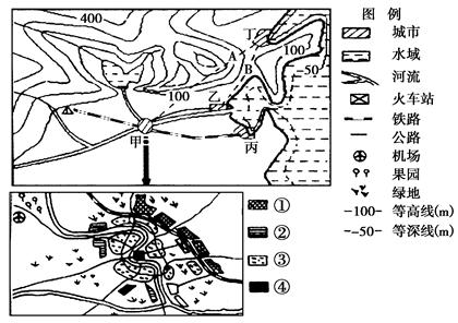 3、综合题 图是东亚某沿海地区示意图,图中乙是传统的港口城市,丙是新建港口城市。读图完成下列问题。(16分)