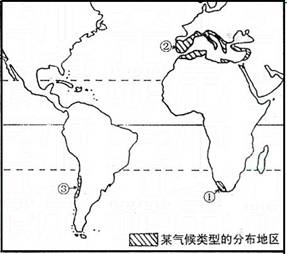 1.该气候的分布地区中,①地区的分布最高纬度较低(低于35°S),其主要的影响因素是:2.②地区与③地区相比较,下列叙述正确的是3.该气候影响下的农作物一般具有