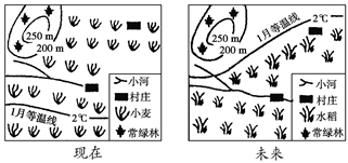 小题1:根据图示,图中的土地利用形式有种植小麦转变为种植水稻。图中1月2℃等温线向北推移,该地温度升高,说明热量更丰富。所以本题选择B选项。