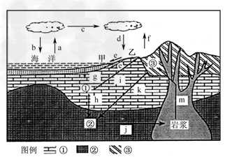 3、单选题 下图是水循环和岩石圈物质循环示意图,其中①②③代表三大类岩石,字母代表水循环或岩石圈物质循环的各环节。读图完成1~3题。
