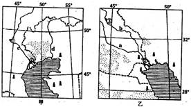 本题解析:本题考查世界区域地理。(1)图示甲位于中亚地区,地处中纬度的大陆内部,故受温带大陆性气候影响;而乙地位于西亚,终年在副热带高压控制下,形成热带沙漠气候。(2)图示a为注入波斯湾的幼发拉底河,为外流河。C为位于里海北部的伏尔加河。(3)影响两地农业的自然条件从气候、地形、土壤、水源等方面分析。(4)把①--②和③--④的图示距离转化到经线上,①--②跨纬度约3°,而③--④跨纬度约4°,故实际距离较远的是③---④。(5)从中东到北美洲的石油运输以海运为主。(6)石油泄漏后,油膜覆盖海面,导致水中生物因缺氧而大量死亡。
