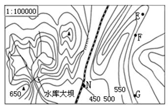 【小题2】从E点到车站N之间,等高线凸向高值方向,为山脊,阻挡视线;图中铁路主要穿过鞍部,海拔较低,地势平坦,影响其走向的主要因素是地形(自然因素);E点海拔在600米到650米之间,F、G两点海拔均为650米;若陡崖在水库大坝正南方,根据图中水库大坝处河流位置的等高线弯曲方向可以确定河流自东向西流。