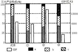 小题1:本组题的解答是建立在对我国产业情况有相当了解的基础之上。分析北京三大产业构成图可知,a、b、c分别表示第一产业、第二产业、第三产业,畜牧业、畜产品的加工、畜产品的销售分别属于第一产业、第二产业、第三产业。
