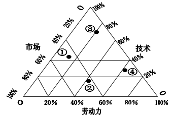 小题1:面临用工困难的严重的企业多数属于劳动力密集型企业。劳动力密集型企业是指劳动力工资成本占总成本的比重较大,通过三角坐标图可以看出劳动力成本比重大的是④,占到了接近62%,所以A正确。