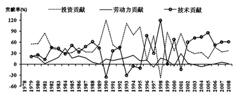 2、单选题 读“1978-2008年投资、劳动力及技术进步对湖南工业增长的贡献”图,判读下