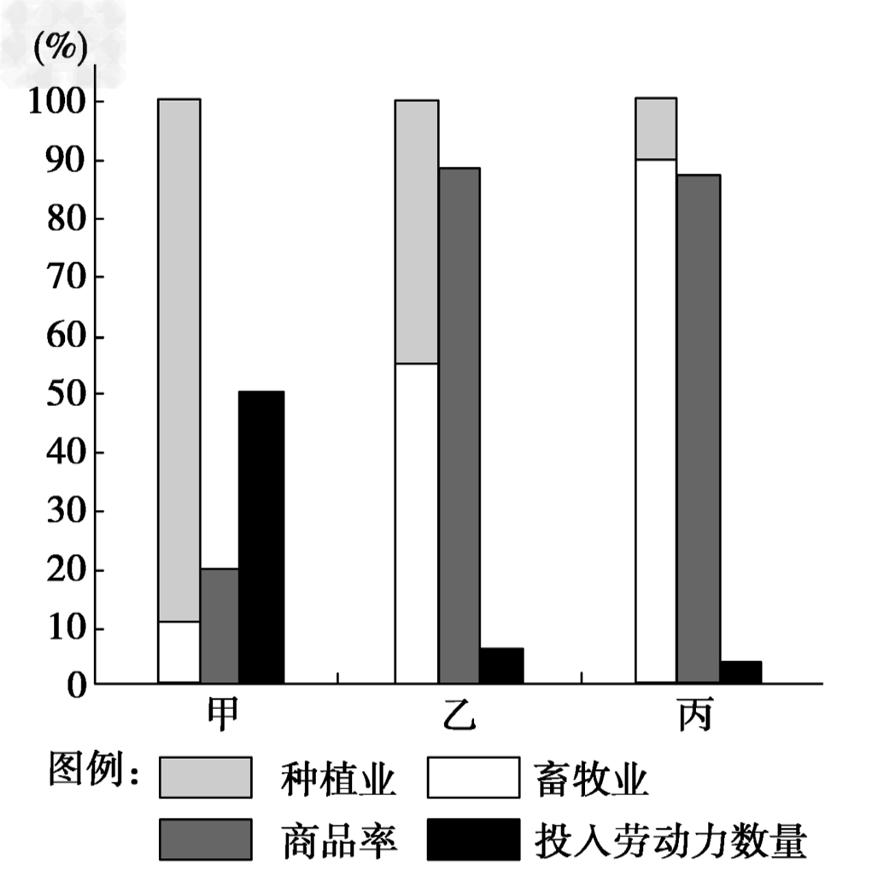 2、单选题 读“甲、乙、丙三个地区农业基本情况比较图”,完成18--20题。