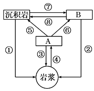 本题解析:岩石A可以和岩浆相互转化,说明A是岩浆岩,因此③和④分别为高温重熔和冷却凝固;B是变质岩,因此⑥⑦是变质作用,⑤⑧是外力作用;①②形成岩浆,仍为高温重熔。花岗岩属于岩浆岩,因此属于崂山花岗岩和变质作用的编号分别是A和⑥⑦。