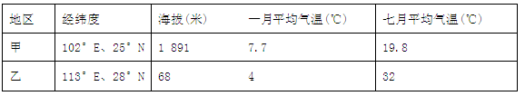 【小题2】一般情况下,海拔越高,气温越低,由表格可知甲地海拔较高,冬季气温较高,乙地海拔较低,冬季气温较低,所以不可能是地形、海拔高度因素造成的气温差异;甲乙两地都位于内陆地区,距海较远,排除海陆因素;故选项B正确。