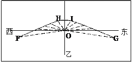 (4)乙图是该小组在某地某日某时段内的杆影轨迹示意图(O为立杆处,虚线为杆影,曲线为杆影端点轨迹)。则图中F、G、H、I四个杆影中最接近日出时段的是?,该日日出的方位是?,北半球的季节是?;当该地杆影最短时,伦敦时间刚好是11时,则该地的经度是?。(4分)