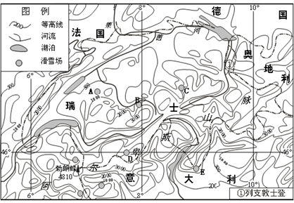 材料二:瑞士位于欧洲中部,是连接东、西欧和南、北欧“十字路口”上的内陆山国。国内人口稠密,资源贫乏,市场狭小,但环境优美,风景绮丽,湖光山色,气候宜人。瑞士拥有很悠久的中立国历史传统,自从1815年以后从未卷入过战争,政局稳定,社会祥和。科教水平及国民素养极高,是全球最富裕、经济最发达和生活水准最高的国家之一,钟表业、金融业、旅游业、航空运输业发达。红十字国际委员会、世界贸易组织、世界银行等众多国际性组织的总部云集瑞士。 (1)瑞士地形以?和?为主。(4分) (2)受地形影响,瑞士的人口主要分布在国土的?,分析依据是此处等高线?,说明地势比较?,有利于人口分布(6分)。 (3)阿尔卑斯山有众多的天然滑雪场,图中瑞士境内最适宜中小学生开展滑雪运动的滑雪场是_______,原因是?。 (6分) (4)依据材料,分析众多国际组织选址瑞士的原因。(6分) (5)钟表业是瑞士人根据本国特点,扬长避短,做出的合理选择。请你结合材料,运用所学知识,简要说明瑞士发展钟表业的合理性。(6分)