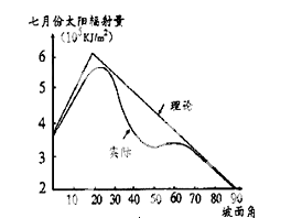 小题1:因当该山坡的坡度与太阳光线垂直时,太阳辐射最强,而随坡角变化,山坡与太阳光线的角度变小,太阳辐射减小,因此此山坡为阳坡;又因在一定坡度实际太阳辐射小于理论值,是因该山坡为迎风坡,多阴雨天气。故选A。