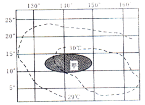 【小题1】根据图中≥30℃的区域所跨的纬度范围进行计算。南北最大区域跨过的纬度超过10°,所以距离大于1110km。所以本题选择B选项。