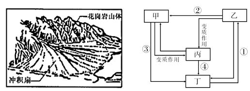 5、单选题 读某山麓冲积扇景观图和岩石圈物质循环示意图,回答下列小题。