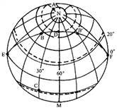 4、综合题 图中EDF是晨昏线,其中ED表示昏线。读图完成下列各题:
