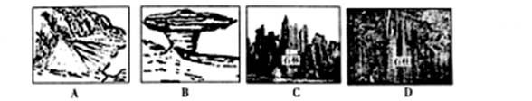 【小题2】A图中有角峰,是冰川侵蚀地貌,M地南北都有高大山脉,有冰川地貌。B是山前冲积扇地貌。C是新月形沙丘,属于风力沉积地貌,在塔里木盆地附近都能见到。D是喀斯特地貌,是在高温多雨的环境下形成的溶蚀地貌,在我国主要分布西南地区。D不常见,选D。