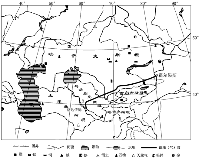 ? 哈萨克斯坦是中亚最大的国家,工农业较发达,主要有采矿、冶金、机械制造等工业。2007年以来,哈萨克斯坦成为中亚地区最重要的油气生产和输出国。2009年12月14日,中国—中亚天然气管道(见图)通气仪式在土库曼斯坦阿姆河右岸举行,该天然气管道开通前,中国从中亚进口的天然气主要依靠海运;管道开通后,不仅缩短了天然气的运输距离,而且安全系数大大提高。中亚各国在能源战略上,希望实现出口的多元化。同时,中亚各国能源企业的发展也迫切需要引进国际资本和技术。