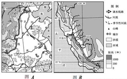 (1)比较图A和图B两地调水方向的差异?(2分),从自然与社会经济分析B图调水方向的原因。?(3分)