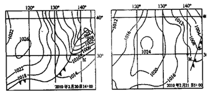 5、单选题 下图是某区域两个时刻的海平面等压线分布图(单位:hPa),读图回答下列问题。