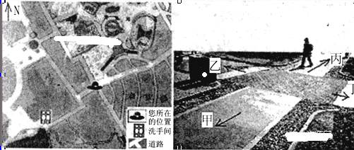 2、单选题 2012 年 10 月下旬上午 9 时,某同学在长江三角洲地区一公园游玩,下图中左图为公园内十字路口附近的导游图,右图为该同学在此路口处的留影。 据此回答下列问题。