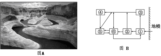 2、单选题 科罗拉多大峡谷为大自然的沧海桑田提供了证据, 被誉为“活的地质教科书”。人们从谷壁可以观察到各个时期的地层,图A为“美国科罗拉多大峡谷景观照片”,图B为“地壳物质循环示意图”,读图完成下题。